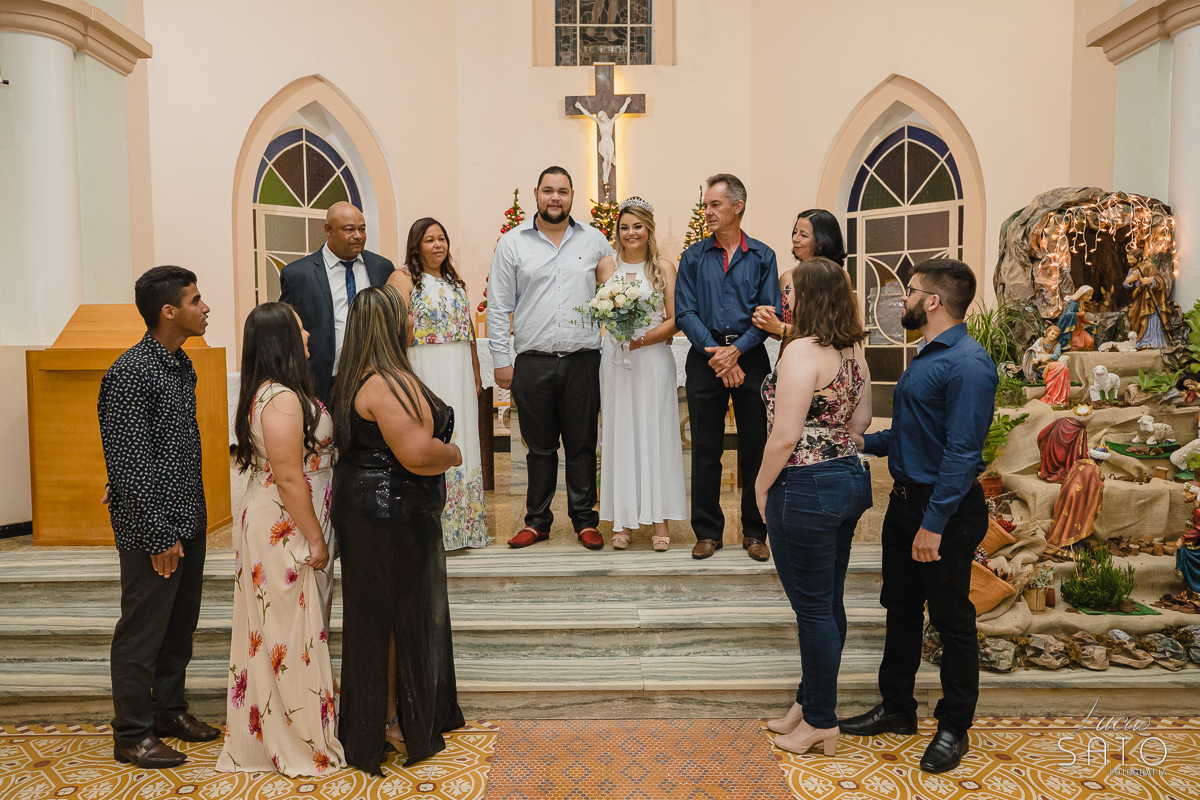 Foto de casal realizado na época de Natal durante a cerimônia de casamento realizado na Igreja Matriz no município de São Gotardo-MG