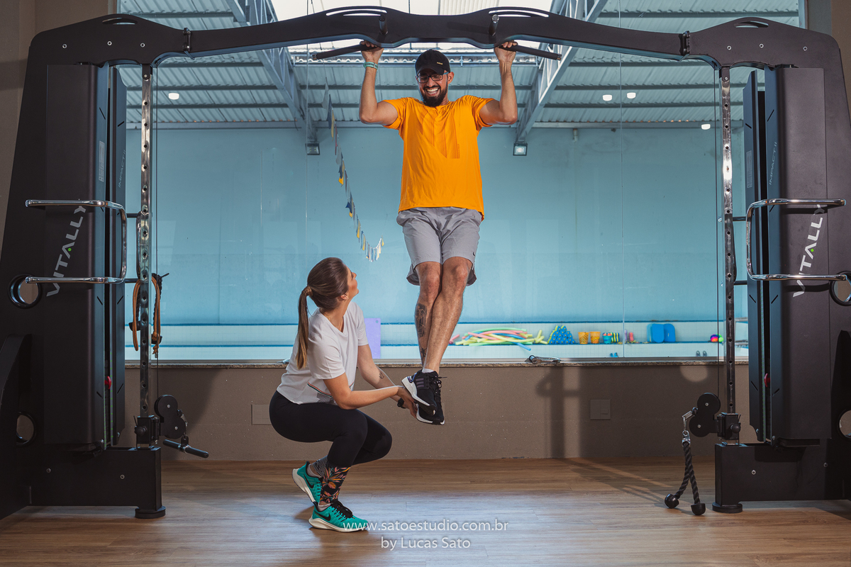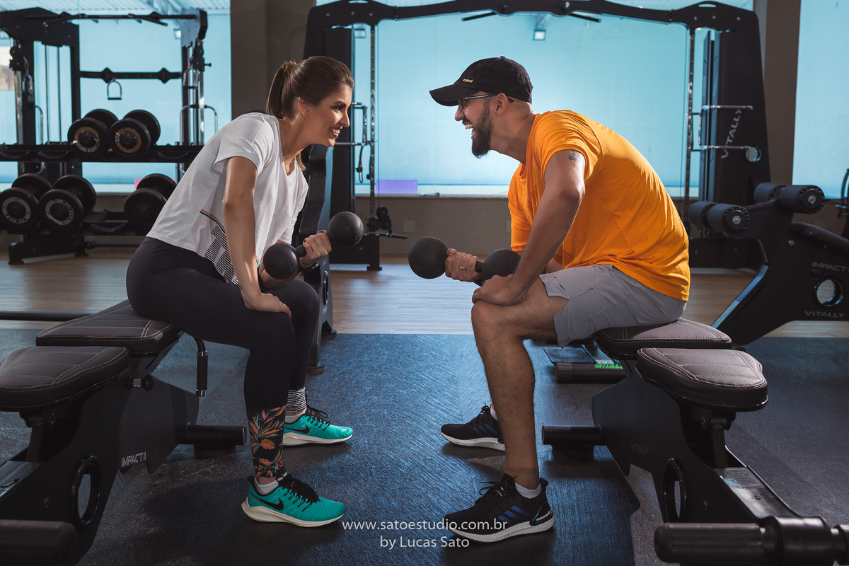 Eles se conheceram na academia e nada melhor que começar o ensaio namorando na academia. Fotografia de pre casamento em São Gotardo-MG.